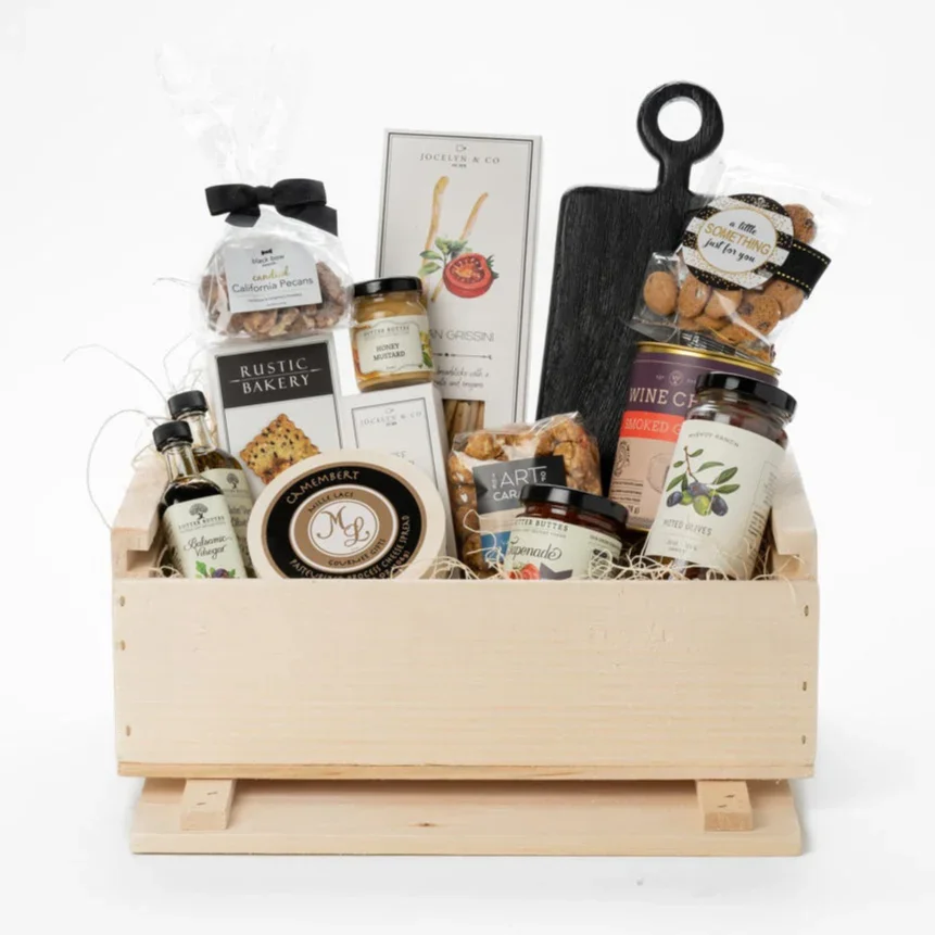 A Merry Box of Treats brings together holiday tea, artisan fig and olive tapenade, rustic fruitcake crisps, creamy Brie, handcrafted salami, peppermint chocolate caramels, and tart dried cranberries, plus festive cocktail napkins to complete your celebration. Perfect for holiday gatherings, cozy nights in, or sharing joy with loved ones. Every bite and sip captures the warmth and flavor of the season.