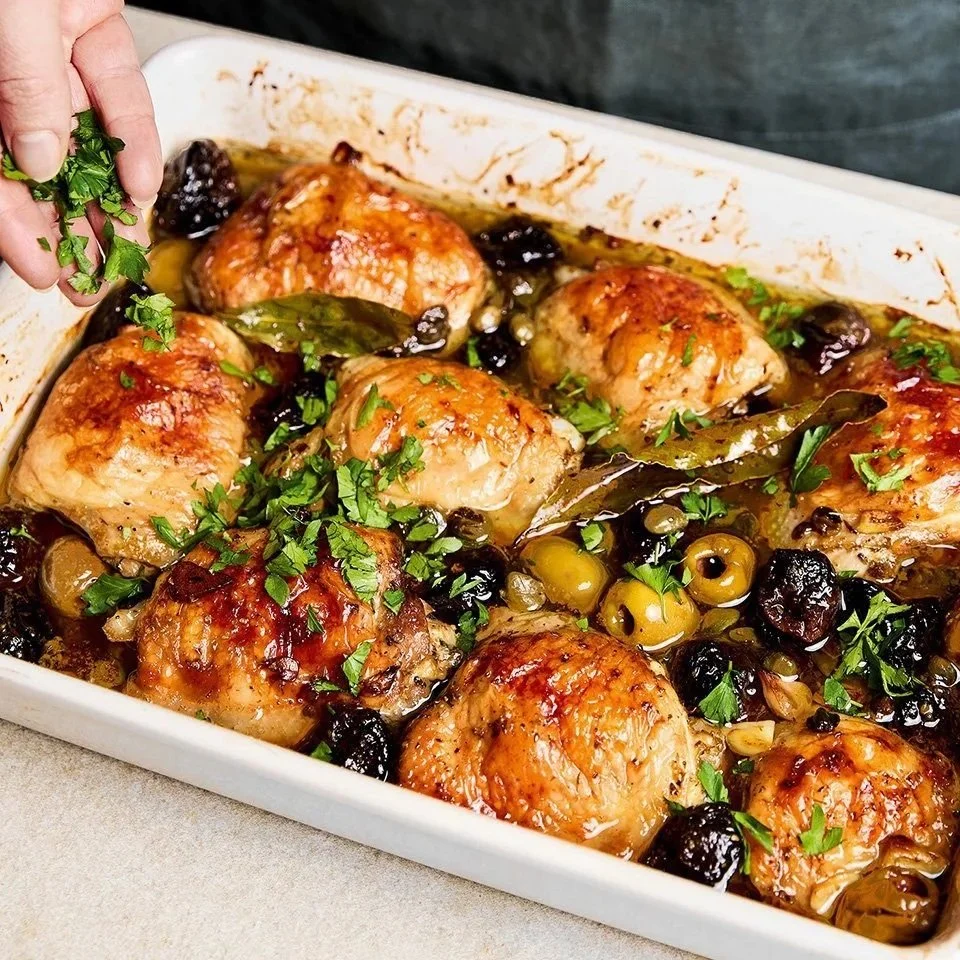 Ingredients: Chicken Breasts, Prunes, Green Olives, Capers, Olive Oil, Vinegar, White Wine, Bay Leaves, Garlic, Oregano, Parsley, Brown Sugar, Salt & Pepper